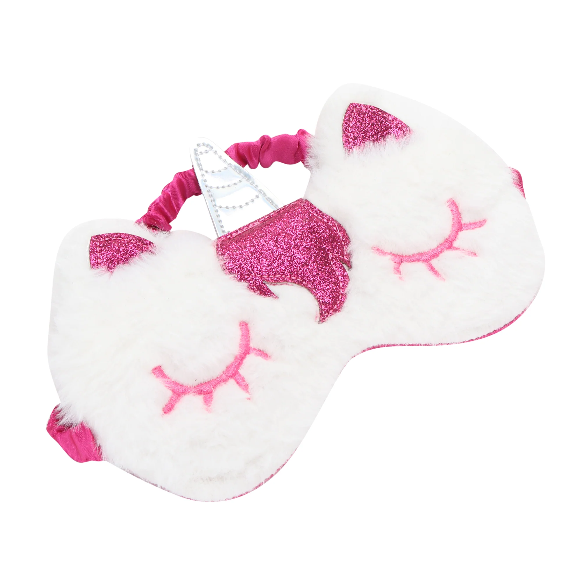 A plush and fuzzy eye mask featuring a unicorn design with embroidered eyelashes, protruding ears and horn with glittered accents, cloud wash, satin lining, and elasticized backstrap.