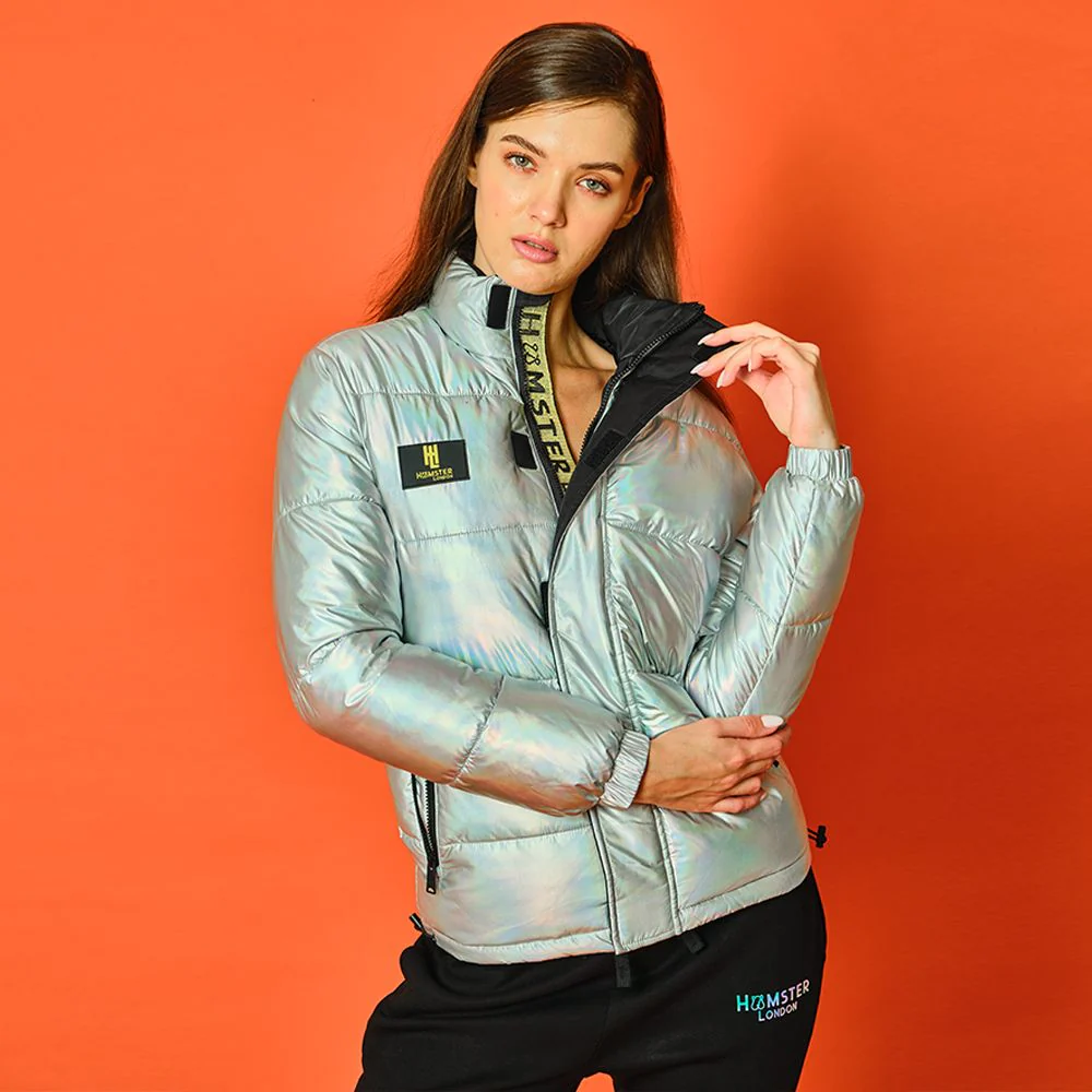 Dazzle through winter with the Hamster London Crystal Jacket in Silver – a statement outerwear piece that blends cozy warmth with sparkling sophistication.